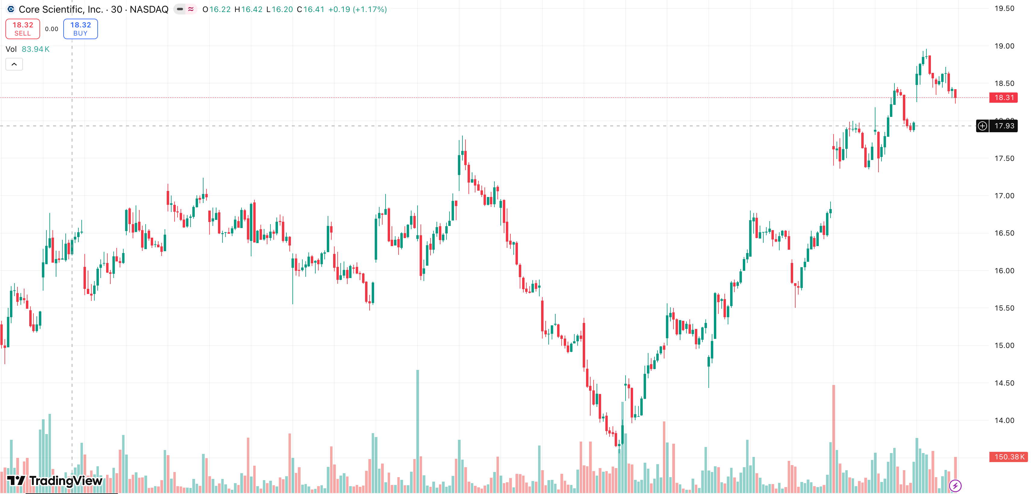 1-month trading summary: Over the past month, Core Scientific has staged a full reset and rebound, dropping hard into late March before snapping back with real conviction. That dip toward the mid-$14.00s did not break the story; it invited buyers in.