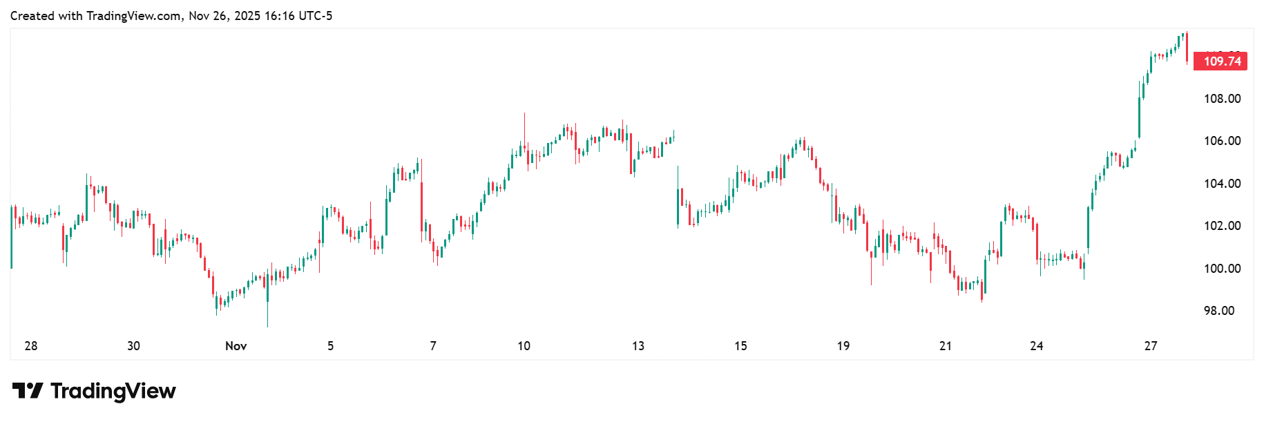 The stock spent early November drifting in the mid-90s to low-100s, but momentum flipped sharply in the final stretch as buyers stepped back in.