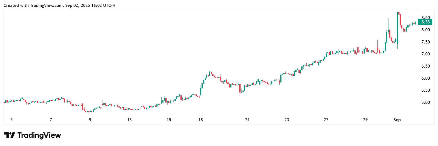 They set the stage for a broader appreciation of its scale ambitions, triggering an upward trajectory and a new all-time high of $8.78 on September 02.